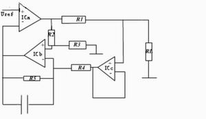 電壓-電流轉(zhuǎn)換模塊還有另外一種方案,即采用三個運放構(gòu)成輸出電流可變的電流源,如圖3所示。輸出電流I=Vi/R1,為使R1兩端的電壓保持恒定,由差分放大器IC1b通過射隨器IC1c監(jiān)測R1兩端的電位,此電位經(jīng)IC1b的7腳加到比較器 ICa的反相輸入端與Vref比較,根據(jù)比較結(jié)果使比較器的輸出端變化,直到平衡為止,即Vr1=Vi。電路中的電容用于補償ICa的頻率,減少控制環(huán)路的延時。只要R1=R2=R3=R4=R5,此電路的性能較好,但帶負載能力不強,環(huán)路延時補償對電路的穩(wěn)定有較大影響。