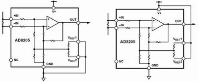 雙極性輸出時(shí)AD8205可以測量流過采樣電阻上的雙向電流,這時(shí),輸出可以偏置到輸出范圍內(nèi)的任意位置。當(dāng)被檢測的正反兩個(gè)方向上的電流為等幅時(shí),其輸出必須偏置到滿量程輸出的中間位置。當(dāng)雙向電流幅值不對(duì)稱時(shí),輸出偏置可以對(duì)應(yīng)地偏離半量程位置。它的兩個(gè)參考輸入VREF1和VREF2分別連接一個(gè)內(nèi)部電阻RREF后接到同一個(gè)內(nèi)部偏置節(jié)點(diǎn),這兩個(gè)參考輸入端的操作方式完全相同。在兩個(gè)參考電壓輸入端接入對(duì)應(yīng)的電壓,即可完成對(duì)輸出的偏置。在雙極性輸出方式下,一般有以下兩種連接方式。