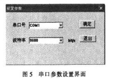 要實現(xiàn)計算機串行通信的功能,一種較為簡便的方法是使用MSComm(Microsoft Communication Control)通信控件,它提供了標準的事件處理函數(shù)過程,是微軟公司開發(fā)的專門用于串行通信的控件。它是高級語言編寫的串行通信程序和PC串口之間的橋粱。本系統(tǒng)采用得就是這種方法。設置控件的屬性。添加控件的響應代碼。就可以使串口按照要求進行工作。在這個界面,可以進行串口號和波特率的設置。通信參效設置界面如圖5所示。