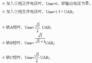 按負(fù)序過(guò)濾器的工作原理,從上述公式中,可得出,在標(biāo)準(zhǔn)電壓輸入下,可以計(jì)算出相關(guān)輸出電壓Umn值,見(jiàn)表1