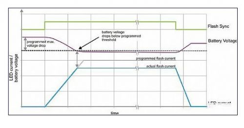 如果閃光燈驅(qū)動(dòng)器本身能夠防止電池電壓下降過多,那么就可以保持較小的安全界限。通過使用一個(gè)受控轉(zhuǎn)換率升高 LED 電流,并在上升期間持續(xù)監(jiān)控電池電壓可以實(shí)現(xiàn)這一目標(biāo)。
