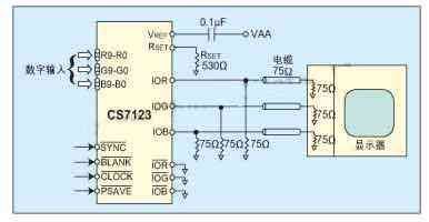 CS7123還有SYNC同步信號和BLANK黑電平控制信號這兩個附加的視頻控制信號,CS7123也具有一個待電模式。CS7123采用5V CMOS工藝制造,單片CMOS結(jié)構(gòu)確保了低功耗性能。CS7123的主要功能是將三路RGB信號轉(zhuǎn)換為模擬RGB信號后輸出到顯示屏顯示。另外,它也可以當(dāng)作三路單獨的DAC使用。