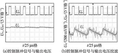 從圖4( a) 中, 可以看出當(dāng)MOSFET 管導(dǎo)通控制信號(hào)為高能量脈沖占空比為DH 時(shí), 輸出電壓Uo 有小幅上升;而MOSFET 管導(dǎo)通控制信號(hào)為低能量脈沖占空比為DL 時(shí), 輸出電壓Uo 有小幅下降, 與仿真波形圖一致。在圖4( b) 中,可觀察輸出電壓Uo 的紋波圖, 能夠更清楚地反映開關(guān)管導(dǎo)通控制信號(hào)與輸出電壓的變化關(guān)系。從圖中,可以更加明顯看到開關(guān)管導(dǎo)通控制信號(hào)的變化對輸出電壓的影響, 與仿真結(jié)果基本一致。