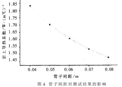 維持其它條件不變,只改變導管上升管與下降管之間的間距,其對巖土導熱系數(shù)的影響見圖4。當管間距變化約為0.0lm時.計算出的導熱系數(shù)變化約為4~8%。由圖中可以看出,間距越大,計算出的導熱系數(shù)越?。哼@是由于間距越大,鉆孔內的熱阻越小,在總熱阻不變的情況下.周圍巖土的導熱熱阻大。即導熱系數(shù)小。因此如何確定管于間距是設計地源熱泵系統(tǒng)中值得認真探討的問題。