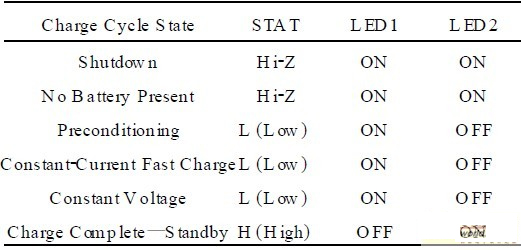 表1MCP73831電路設(shè)計中指示燈的邏輯關(guān)系
