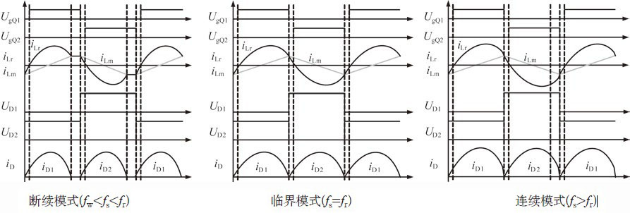 諧振網(wǎng)絡(luò)由諧振電感L r、諧振電容C r、激磁電感L m組成。圖2為其主要的理想工作波形,根據(jù)工作頻率的不同,我們可以把它分為三個模式,即斷續(xù)模式(fw<fs<fr)、臨界模式(fs=fr)和連續(xù)模式(fs>fr),其中fw為第一諧振頻率,fr為第二諧振頻率,fs為開關(guān)管工作頻率。