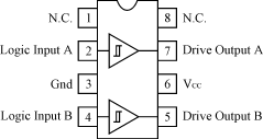 MC34152的外圍電路簡單,應用方便。它是8管腳的同相推挽驅動芯片,具體的內部結構和封裝如圖4所示。腳2與腳4為兩路控制信號輸入,經過芯片內部的推挽放大,直接輸出同相的兩路驅動信號(腳7及腳5)。為使芯片更加穩(wěn)定地工作,一般在芯片的電源端并聯(lián)一個濾去高頻干擾的瓷片電容和一個濾去低頻干擾的電解電容。
