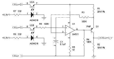 由于本文實(shí)驗(yàn)中采用的采樣電路參考電壓為2.5V,因此需要把電池電壓進(jìn)行2倍衰減,所以選擇了R1=2R2,電路中電容C1為去耦電容,電阻R5為限流電阻,電阻R4用于保證電路可靠工作,為了減少電壓檢測(cè)電路的漏電流,在每節(jié)單體電池電壓檢測(cè)線上加入AQW216光電繼電器作為檢測(cè)控制開關(guān),如圖2所示,當(dāng)需要檢測(cè)電池電壓時(shí),通過(guò)控制端打開光電繼電器,檢測(cè)完關(guān)閉光電繼電器,可有效減少檢測(cè)時(shí)的漏電流對(duì)電池組一致性的影響。