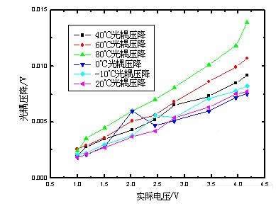 (1)光電繼電器的誤差。光電繼電器的特性,受溫度和導(dǎo)通內(nèi)阻的影響都較多,為了驗(yàn)證光電繼電器導(dǎo)致的測(cè)量誤差,在不同溫度調(diào)節(jié)下對(duì)光電繼電器和電壓檢測(cè)電路進(jìn)行了實(shí)驗(yàn),在光電繼電器上壓降如圖3所示,可以看出測(cè)試電壓越高,光電繼電器上的壓降越大,最大差異約6mV左右,而溫度越高,壓降也越大,最大差異約7mV左右。