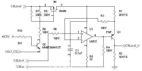 圖中CELLn為第n節(jié)單體電池的電壓,該電路可以對(duì)多串電池組的電壓進(jìn)行測(cè)量,并且不受串聯(lián)節(jié)數(shù)的限制,而對(duì)串聯(lián)電池組中的第一節(jié)單體電壓不用采用該電路測(cè)量,可直接測(cè)量或者通過(guò)電阻分壓得到。該電路的工作原理如下:在電路正常工作時(shí),運(yùn)放處于放大狀態(tài),運(yùn)放的1、3腳為虛短虛斷狀態(tài),即3腳的電壓等于CELLn+1端的電壓,而由于運(yùn)放的輸入阻抗非常大,因此電阻R3上的電流可忽略,在電阻R1上就是一節(jié)單體電池的電壓,流過(guò)電阻R1的電流大小為:
