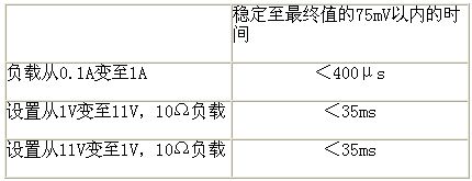 瞬態(tài)響應(yīng)的測試需要對負載阻抗和電源設(shè)置施加較大的階躍變化,并測量穩(wěn)定至最終值的時間(如表1)。吉時利全部2200系列電源的電壓瞬態(tài)響應(yīng)都給出了三個條件:增大負載,提高設(shè)置和降低設(shè)置。
