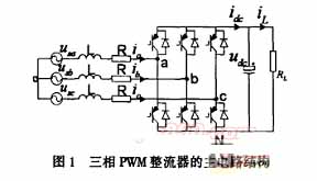圖1是三相PWM整流器的拓樸結(jié)構(gòu),功率開關(guān)按采用的調(diào)制方式動(dòng)作,由于輸入電感的濾波作用,整流器交流側(cè)可近似認(rèn)為是三相正弦電流;直流側(cè)有大電容穩(wěn) 壓,輸出呈直流電壓源特性,穩(wěn)態(tài)時(shí)輸出直流母線電壓可保持不變,一般情況下,要求控制輸入電流與輸入電壓同相位,通常采用電壓外環(huán)和電流內(nèi)環(huán)的雙環(huán)控制方 式,電壓外環(huán)主要是保證直流輸出電壓穩(wěn)定,電流內(nèi)環(huán)主要是按電壓外環(huán)輸出的電流指令進(jìn)行電流控制,如實(shí)現(xiàn)單位功率因素正弦波電流控制。