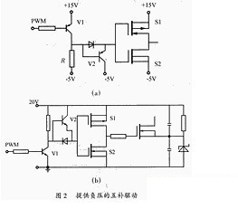 功率MOSFET屬于電壓型控制器件,只要柵極和源極之間施加的電壓超過(guò)其閾值電壓就會(huì)導(dǎo)通。由于MOSFET存在結(jié)電容,關(guān)斷時(shí)其漏源兩端電壓的突然上升將會(huì)通過(guò)結(jié)電容在柵源兩端產(chǎn)生干擾電壓。常用的互補(bǔ)驅(qū)動(dòng)電路的關(guān)斷回路阻抗小,關(guān)斷速度較快,但它不能提供負(fù)壓,故其抗干擾性較差。為了提高電路的抗干擾性,可在此種驅(qū)動(dòng)電路的基礎(chǔ)上增加一級(jí)由V1、V2、R組成的電路,產(chǎn)生一個(gè)負(fù)壓,電路原理圖如圖2(a)所示。