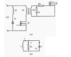 電路原理圖如圖3(a)所示,N3為去磁繞組,S2為所驅(qū)動(dòng)的功率管。R2為防止功率管柵極、源極端電壓振蕩的一個(gè)阻尼電阻。因變壓器漏感較小,且從速度方面考慮,一般R2較小,故在分析中忽略不計(jì)。其工作波形分為兩種情況,一種為去磁繞組導(dǎo)通的情況,見(jiàn)圖4(a);一種為去磁繞組不導(dǎo)通的情況,見(jiàn)圖4(b)。