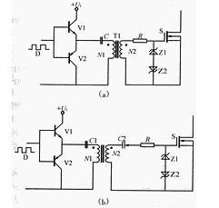 圖1(a)為常用的小功率驅(qū)動(dòng)電路,簡(jiǎn)單可靠成本低。適用于不要求隔離的小功率開(kāi)關(guān)設(shè)備。圖1(b)所示驅(qū)動(dòng)電路開(kāi)關(guān)速度很快,驅(qū)動(dòng)能力強(qiáng),為防止倆個(gè)MOSFET管直通,通常串接一個(gè)0.5~1Ω小電阻用于限流,該電路適用于不要求隔離的中功率開(kāi)關(guān)設(shè)備。這兩種電路結(jié)構(gòu)特簡(jiǎn)單。
