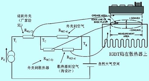 圖2中:rθ(j-c)是器件結(jié)到管殼基準點穩(wěn)態(tài)熱阻,由制造廠家提供,一般在數(shù)據(jù)表中給出上限值或給出瞬態(tài)熱阻曲線取t→∞的穩(wěn)態(tài)值;rθ(c-a)是管殼未通過散熱器直接到空氣的熱阻,通常不考慮;rθ(c-s)是管殼到散熱器的觸熱阻,通常由制造廠家在數(shù)據(jù)表中給出;rθ(c-a)是散熱器基準點到環(huán)境基準點的熱阻,其值由散熱器形式、尺寸和冷卻方式?jīng)Q定;ta是環(huán)境溫度。