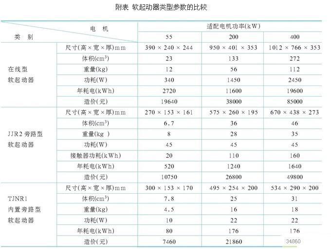 從表中可以看出,旁路型軟起動器優(yōu)于在線型軟起動器,而內(nèi)置旁路型軟起動器的優(yōu)于旁路型和在線型軟起動器。但價格卻是越先進,成本越低,這是高科技的一般規(guī)律。以附表內(nèi)舉例品牌來比較,在線型軟起動器是旁路型軟起動器的1.5倍,旁路型軟起動器的是內(nèi)置旁路型軟起動器的1.4倍(不算接觸器的價格)。而能耗比較,在線型軟起動器是旁路型軟起動器的10倍左右,而旁路型軟起動器的是內(nèi)置旁路型軟起動器的7倍左右。