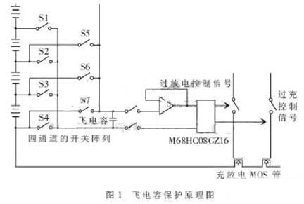 對(duì)于單體電池的檢測(cè),主要采用飛電容技術(shù)。飛電容技術(shù)的原理圖如圖1所示,為電池組后4節(jié)的保護(hù)電路圖,通過(guò)四通道的開關(guān)陣列可以將后4節(jié)電池的任意1節(jié)電池的電壓采集到單片機(jī)中,單片機(jī)輸出驅(qū)動(dòng)信號(hào),控制MOS管的導(dǎo)通和關(guān)斷,從而對(duì)電池組的充電放電起到保護(hù)作用。