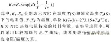 采用熱敏電阻作為溫度傳感器進(jìn)行溫度采樣。熱敏電阻是一種熱敏性半導(dǎo)體電阻器,其電阻值隨著溫度的升高而下降。電阻溫度特性可以近似地用下式來(lái)表示: