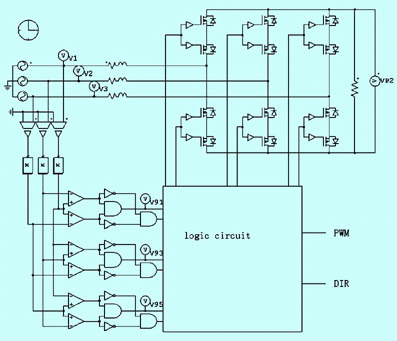 虛擬整流技術(shù)的實現(xiàn),主要通過三相同步檢測電路取得同步控制信號,然后控制功率器件來模擬二極管橋式整流電路對三相交流電進行整流,同時防止輸入的三相交流電相間短路。其原理如圖9所示,是一個輸出方向固定的虛擬整流電路。仿真波形如圖5所示,它們分別是矩陣變換單元的三相輸入電壓、6路同步信號和虛擬整流后得到的輸出電壓波形。
