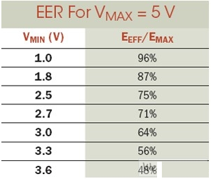 其中EMAX代表電容器存儲(chǔ)的總能量。等式2明確表明,隨著我們通過減少電容器內(nèi)的駐留電能,而降低了被供電電路的最低工作電壓VMIN,有效能效比可獲得極大地提升。對(duì)任何以電容供電的電路來說,能效比都是一個(gè)非常重要的設(shè)計(jì)考慮?! ?br />