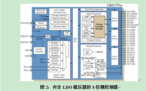 CMOS邏輯門的動態(tài)功耗可寫為:P = C × V2 × f,其中C為負載電容,它是設(shè)計和工藝技術(shù)的函數(shù);V為供應(yīng)電壓;f則是開關(guān)頻率,它是應(yīng)用處理需求的函數(shù)。電源電壓是控制功耗的主要手段,因此若能像C8051F9xx內(nèi)含低壓差 (LDO) 穩(wěn)壓器一樣,直接在芯片中增加電壓轉(zhuǎn)換功能,就能提供穩(wěn)定的1.8V電壓給微控制器的數(shù)字核心 (參考圖2),使動態(tài)功耗大幅下降。