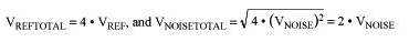 多個(gè)基準(zhǔn)源串聯(lián)可以降低LF噪聲。使用多個(gè)電壓源(每個(gè)電壓源等效于一個(gè)直流源和一個(gè)噪聲源)時(shí),直流電壓線(xiàn)性增加,噪聲源(如果非相關(guān))則是以RMS幾何求和。例如,使用四個(gè)基準(zhǔn)源,每個(gè)基準(zhǔn)源等效于一個(gè)VREF基準(zhǔn)和一個(gè)VNOISE噪聲,則產(chǎn)生如下輸出: