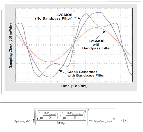 不匹配的原因是,計算得出的孔徑抖動是基于時鐘源生成器的快速轉(zhuǎn)換速率。CDCE72010 的 LVCMOS 輸出消除了時鐘信號的高階諧波,其有助于形成快速升降沿。圖 13 所示波形圖表明了帶通濾波器急劇降低未濾波 LVCMOS 輸出轉(zhuǎn)換速率,以及將方波轉(zhuǎn)換為正弦波的過程。
