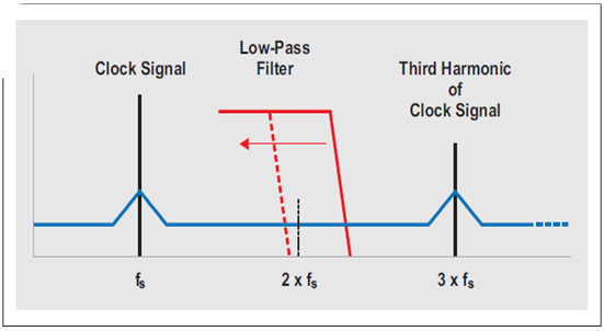 要設(shè)定使用未濾波時鐘時的正確積分上限,我們必須再一次復(fù)習(xí)一下采樣理論。CDCE72010 的未濾波時鐘輸出看起來像一種具有快速升降沿的方波,而其升降沿由時鐘頻率的基頻正弦波高階諧波引起。這些諧波的振幅比基頻低,且其振幅隨諧波階增加而下降。