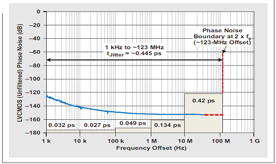 將不同轉(zhuǎn)角頻率的低通濾波器用于 ADS54RF63 的采樣時鐘(如圖 18 所示),得到了一些如表 7 所列有趣值。該試驗結(jié)果表明,LVCMOS 輸出對時鐘抖動的相位噪聲影響被限制在約 200 到 250 MHz,其相當(dāng)于 122.88-MHz 時鐘信號的 80-MHz 到 130-MHz 偏移頻率,并約為 2x 采樣頻率。因此,將寬帶相位噪聲擴至 123-MHz 偏移頻率,會產(chǎn)生 ~445 fs 的時鐘抖動,如圖 19 所示。理想情況下,積分下限應(yīng)該位于 500 Hz 處(原因是選擇的 131000點FFT);但是,500-Hz 到 1 kMz 偏移頻率的抖動貢獻值極其低,因此為了簡單起見其在本測量中被忽略。