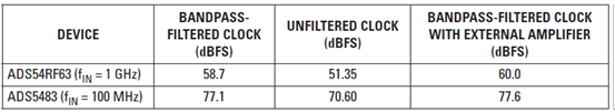 本文介紹了使用某個濾波或未濾波時鐘源時,如何正確地估算數(shù)據(jù)轉(zhuǎn)換器的 SNR。表 9 概括了得到的結(jié)果。盡管時鐘輸入的帶通濾波器對于最小化時鐘抖動是必要的,但實驗表明它會降低時鐘轉(zhuǎn)換速率,并使 ADC 的孔徑抖動降級。因此,最佳的時鐘解決方案應(yīng)包括一個限制相噪影響的帶通濾波器,以及一定的時鐘振幅放大和轉(zhuǎn)換速率,目的是最小化 ADC 的孔徑抖動。