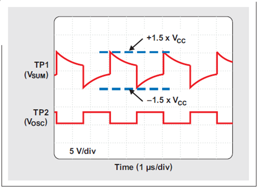 著名的三反相門振蕩器由 U1a、U2a 和 U2b 組成,選擇它是因為它在供電波動方面較為穩(wěn)定。通過一個 100-pF 陶瓷電容器(COSC)和兩個 10-kΩ 電阻器(ROSC1 和 ROSC2),它的正常頻率被設(shè)定為 330kHz。在 3.0-V 到 3.6-V 電源電壓波動范圍內(nèi),振蕩器擁有接近 50% 的占空比,以及低于 ±1.5% 的最大頻率波動。圖 2 顯示了 ROSC1 和 ROSC2 (TP1) 相加點和振蕩器輸出 (TP2) 處的波形。所有電壓均為參考電路基準(zhǔn)電壓測得。[page]