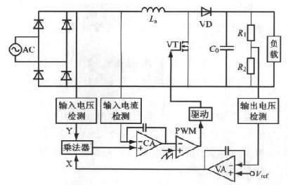 工作原理:APFC主電路的輸出電壓經(jīng)電阻分壓后與基準(zhǔn)電壓相比較,誤差值輸入到VA;VA 輸出信號(hào)X與輸入電壓檢測(cè)信號(hào)Y一起輸入乘法器,經(jīng)過(guò)平均化處理、放大、比較后,再經(jīng)過(guò)PWM 比較器加到柵極驅(qū)動(dòng)器,產(chǎn)生對(duì)開(kāi)關(guān)管VT的控制信號(hào),從而使電感Ls上的電流(即輸入電流)平均值始終跟蹤模擬乘法器輸出的半正弦信號(hào),即跟蹤了輸入電壓波形,并實(shí)現(xiàn)了輸入電流正弦化,使功率因數(shù)接近1,達(dá)到校正功率因數(shù)的目的。
