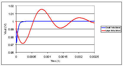 圖 2 對(duì)小和大互連電感的負(fù)載瞬態(tài)期間的輸出電壓變化模擬情況進(jìn)行了比較。小電感響應(yīng)快速漸次減弱,而大電感則并非如此,花費(fèi)了較長(zhǎng)的時(shí)間才穩(wěn)定下來。這是由于特性阻抗更高以及諧振頻率更低。另外,如果負(fù)載電流在該諧振頻率有規(guī)律地跳動(dòng),則會(huì)出現(xiàn)極寬且具破壞性的電壓變化。