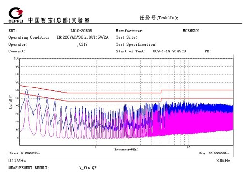 5. 具有較低的EMI性能。EN55011有l(wèi)evel B,level A兩個(gè)等級(jí),level B比level A嚴(yán)苛得多。圖2、圖3是LD10產(chǎn)品的EMI測(cè)試數(shù)據(jù),該數(shù)據(jù)由國(guó)家電子五所專業(yè)測(cè)試。測(cè)試結(jié)果可以看出,該系列電源具有較低的電磁輻射性能,達(dá)到EN55011,level B的要求。