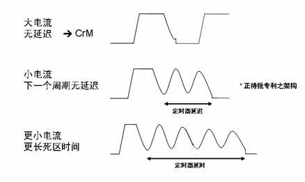 具體講,CCFF架構(gòu)具有固定導(dǎo)通時間控制和頻率反走特性。在大電流時,電路以臨界導(dǎo)電模式工作。小電流時(重負(fù)載時接近線路過零點(diǎn),輕載時位于全部正弦方波),因此,磁芯復(fù)位后下一個周期并不會立即啟動;相反,定時器開始調(diào)節(jié)死區(qū)時間;電流越小,定時器持續(xù)時間(死區(qū)時間)越長;定時器持續(xù)時間取決于大小;定時器僅控制死區(qū)時間(不控制開關(guān)周期/關(guān)閉時間)。由于死區(qū)時間不受電流周期時長變化的影響,因此可以毫不猶豫地進(jìn)行谷底導(dǎo)通。
