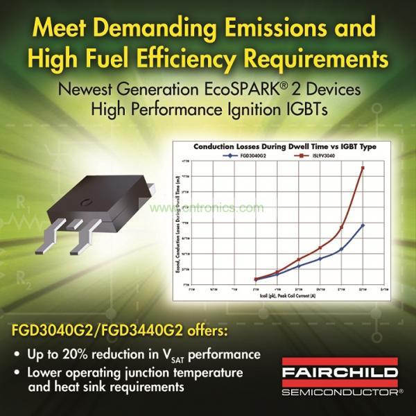 為了滿足現(xiàn)今和新興點火系統(tǒng)對排放和高燃油效率的嚴(yán)苛要求,汽車設(shè)計人員需要更高性能的點火線圈驅(qū)動器技術(shù)。為幫助設(shè)計人員滿足這些要求,飛兆半導(dǎo)體公司推出了在較小的占位面積下具有更低功耗的最新一代點火IGBT器件。EcoSPARK2、FGD3040G2和FDG3440G2點火線圈驅(qū)動器可將VSAT降低多達(dá)20%,而不會顯著降低自箝位感性負(fù)載開關(guān)(Self Clamping Inductive Switching, SCIS) 的能量。這項優(yōu)化特性減低了功耗和工作結(jié)溫,并降低了對散熱器的要求。