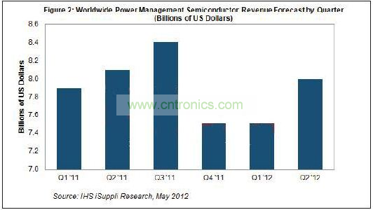 據(jù)IHS iSuppli公司的電源管理市場追蹤報告,繼2011年第四季度慘跌之后,電源管理半導(dǎo)體在2012年初有所回升,并在第二季度終于走上明顯增長之路,主要是受消費與工業(yè)領(lǐng)域的擴(kuò)張推動。