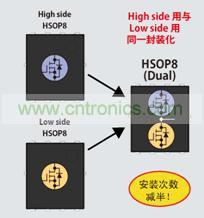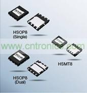 根據(jù)不同用途,提供3種小型封裝。HSMT8比HSOP8的安裝面積減少了65%,為節(jié)省空間做出巨大貢獻。而且,產品陣容中還包括DC/DC電源電路中的高邊(High Side)用MOSFET與低邊(Low Side)用MOSFET復合化的新封裝HSOP8(Dual)。不僅安裝面積減小,而且還可有助于減少安裝次數(shù)。