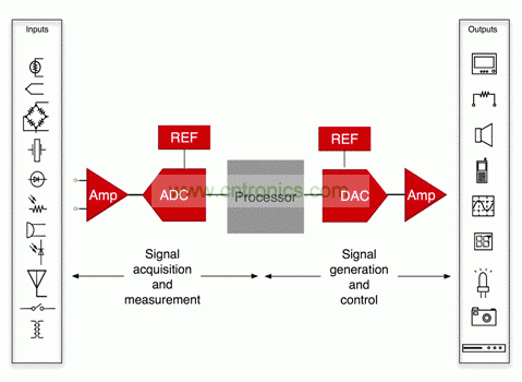 圖 1 所示結構圖可代表信號處理的所有系統(tǒng)。如果它是一個測量或者數(shù)據(jù)采集系統(tǒng),則信號鏈開始于傳感器,經(jīng)過信號調(diào)節(jié)電路,進入一個 ADCr,然后結束于處理器。如果它是一個控制系統(tǒng)、一個音頻處理系統(tǒng)亦或是一個軟件定義無線電設備則可能存在一些必須變回到模擬信號的處理器輸出;這種情況顯示在結構圖的右手側二分之一處。