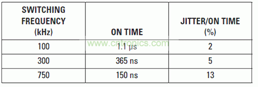 高轉(zhuǎn)換比和更高頻率時,會存在噪聲問題。當選擇某個高開關(guān)頻率時,設(shè)計人員應(yīng)考慮抖動和DC/DC轉(zhuǎn)換器的最小“導通”時間。當占空比較小時,抖動噪聲便為開關(guān)脈沖的更大百分比。表6顯示了48-V到5-V轉(zhuǎn)換比時,抖動與“導通”時間之比。我們假設(shè),在該相位節(jié)點上存在0.5-V二極管壓降和20-ns抖動。