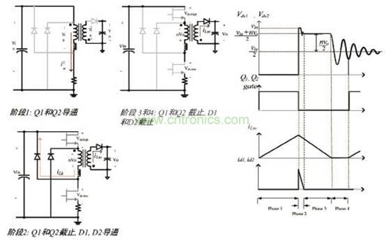 雙管反激拓?fù)涞暮锰幹歉呖煽啃院偷烷_關(guān)損耗。由于低MOSFET漏源電壓得到良好的可靠性,允許大匝數(shù)比(n)設(shè)計(jì)實(shí)現(xiàn)近似于ZVS開關(guān)的低開關(guān)損耗。
