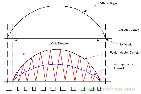 在半個(gè)輸入電壓周期內(nèi), 控制TON固定, 則電感電流峰值跟隨輸入電壓峰值, 且相位相同, 實(shí)現(xiàn)高功率因素PF, 有如下等式:
