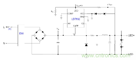 隨著目前法規(guī)和能效的需求, 針對(duì)LED應(yīng)用提出高PF以及適應(yīng)全電壓范圍都能可靠工作的要求, 并且朝小型化方面發(fā)展, 因此之前的填谷式的PFC電路也需要增加兩個(gè)高壓電容因體積的限制不太適合應(yīng)用。有鑒如此, 國(guó)內(nèi)外很多廠商都推出了適應(yīng)球泡燈和T管之類的非隔離電源應(yīng)用驅(qū)動(dòng)方案, 下面就以通嘉科技的LD7832做為典型介紹。
