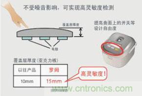 在靈敏度方面,通過獨(dú)創(chuàng)的高速采樣,使該產(chǎn)品在厚達(dá)15mm的覆蓋層中亦可使用。這使以往很難實(shí)現(xiàn)的在有一定厚度的圓形面板和曲面面板中應(yīng)用觸控開關(guān)成為可能。