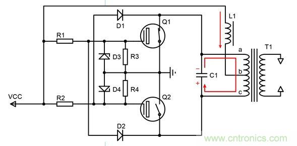 7. (圖3)由于T1對C1的持續(xù)充電,C1上電壓為a正c負,通過兩個二極管使Q2柵極電壓升高,Q1柵極逐漸下降,同時正反饋形成,Q2導通,Q1截止。