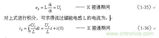 式中的負號表示反電動勢eL的極性與(1-35)式中的符號相反,即: K關(guān)斷期間電感L產(chǎn)生電動勢的方向與K接通期間電感L產(chǎn)生電動勢的方向正好相反。