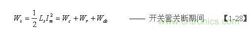 【1-28】式中,Wc 為電源開關(guān)管由導(dǎo)通到完全關(guān)斷期間電容器C儲存的能量, Wr為電源開關(guān)管由導(dǎo)通到完全關(guān)斷期間電阻R損耗的能量,Wds 為電源開關(guān)管由導(dǎo)通到完全關(guān)斷期間漏極電流(逐步減?。﹄娙萜鰿充電產(chǎn)生分流作用所做的功。