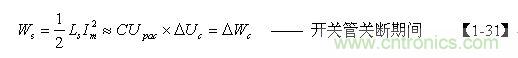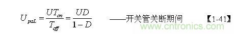 【1-41】式中,U為電源輸入電壓,Ton為電源開關(guān)管的導(dǎo)通時(shí)間,Toff為電源開關(guān)管的關(guān)斷時(shí)間,D為占空比。而Upau可根據(jù)漏感Ls 與開關(guān)變壓器初級線圈的電感L的比值k求得。