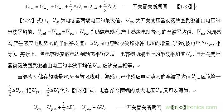 【1-48】和【1-49】式就是我們用來計(jì)算RCD尖峰脈沖吸收電路參數(shù),電阻R、電容器C的容量、電容吸收尖峰脈沖的電壓增量 、以及開關(guān)變壓器初級線圈反激輸出電壓的半波平均值 Upal 和開關(guān)管導(dǎo)通時(shí)間Ton等參數(shù)的關(guān)系式。